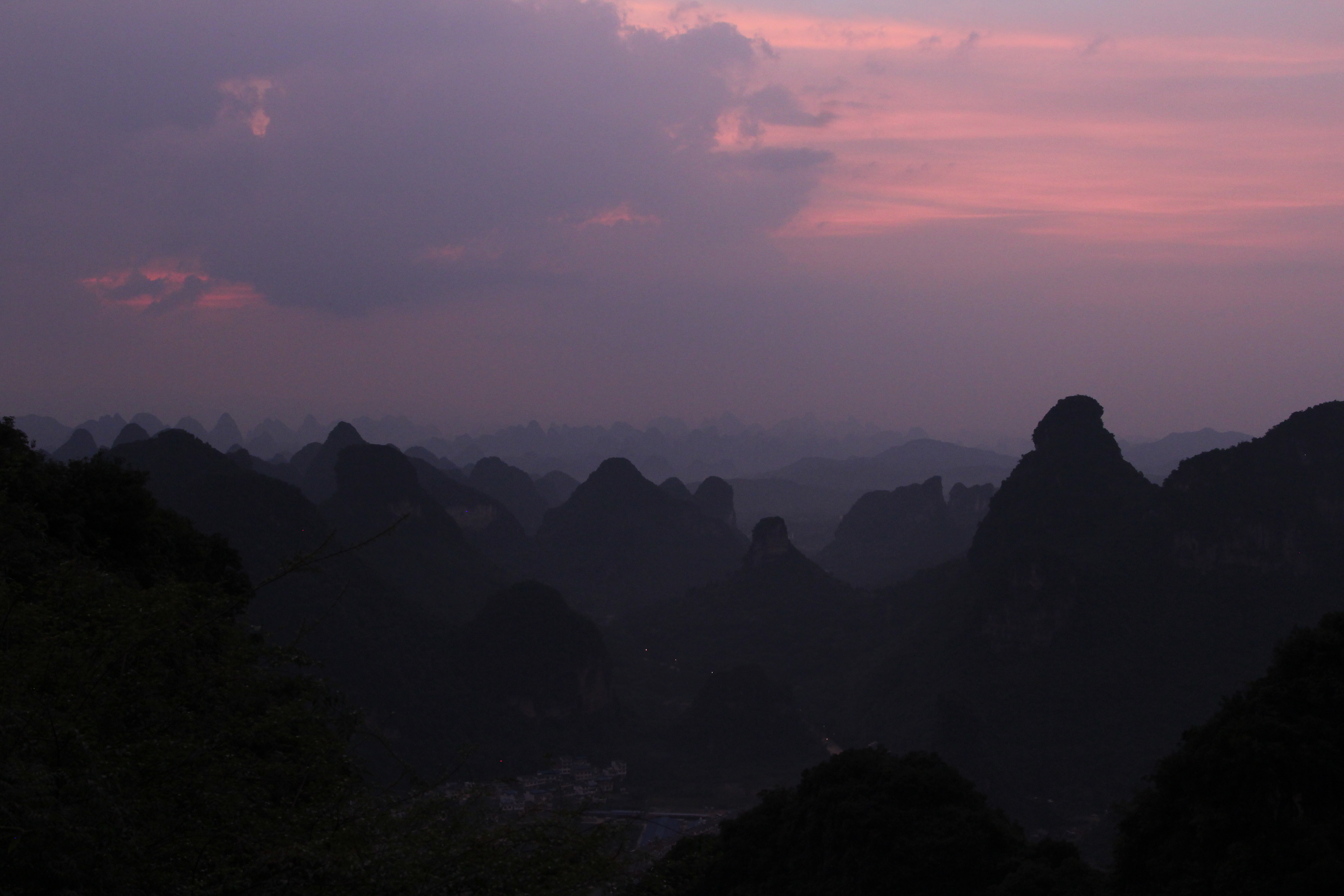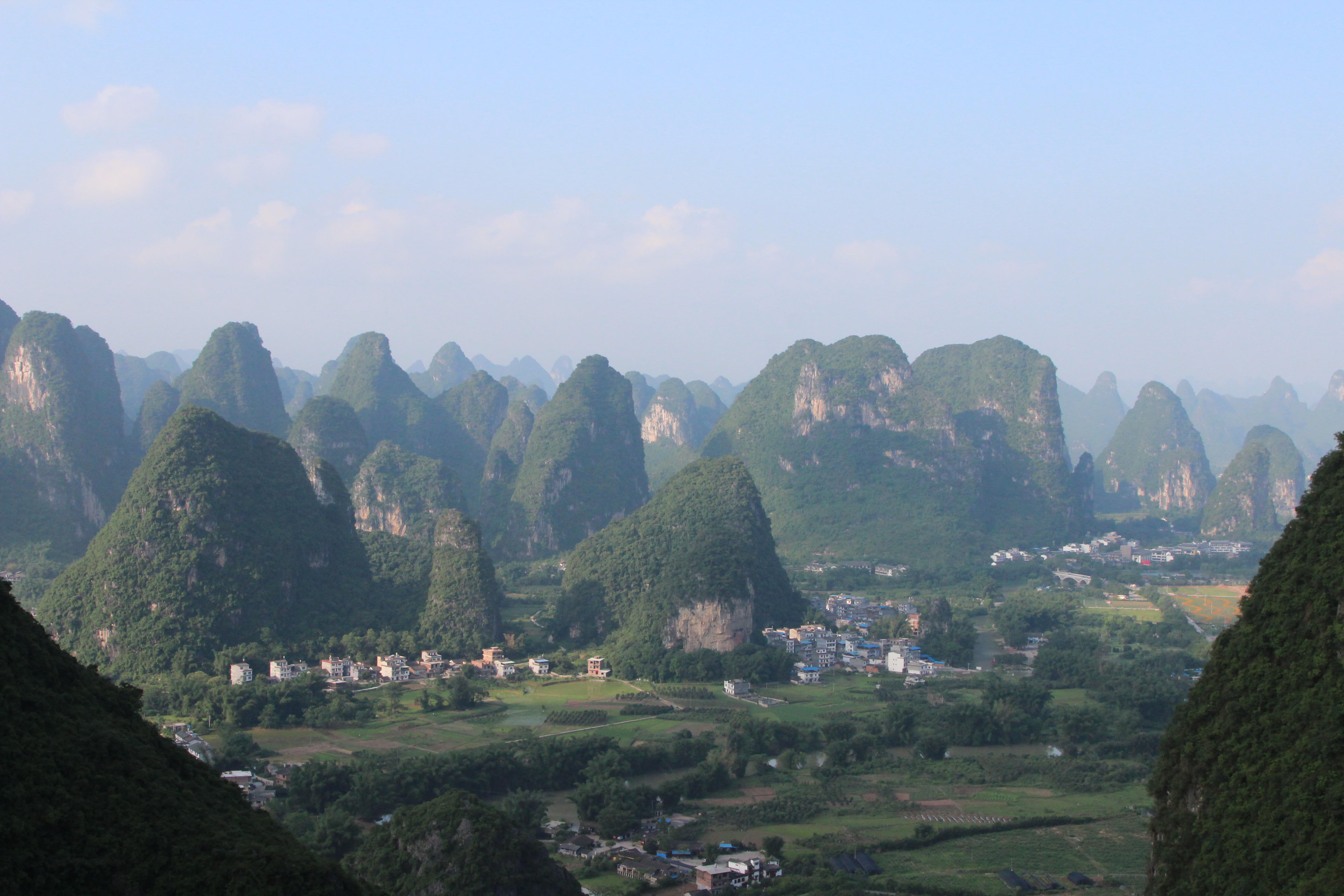 Nous étions immergées dans la Chine continentale (au sud). Arrivées de nuit à l’aéroport de Guilin, nous avons pris un taxi direction Guilin. nous avons déjà pu soupçonner le paysage incroyable qui nous attendait. Nous apercevions de nombreux grands fantômes se répétant presque à l’infini. Le lendemain, nous ne fumes pas déçues, car d’énormes pain de sucre ronds se dessinaient tout autour de la petite ville chinoise, largement saupoudrés de végétation type « jungle dense ».